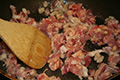 7. Once the color of the Gobou(=Burdock root) begins to change and the vegetable becomes soft, add sugar, and stir some more.