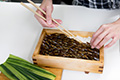 4. Wipe off water in a mold and put vinegar rice. Press it to make surface smooth.