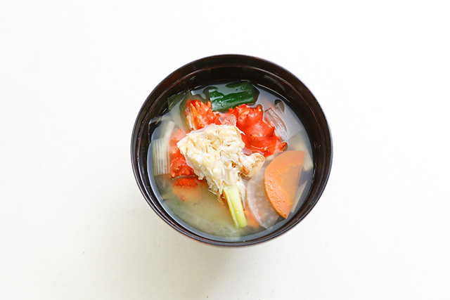 3. Put crab and white part of green onion in a pot and as soon as it boils, add sake and dissolve miso. Serve in a bowl and garnish with green part of green onion.