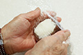 3. Mash the rice with a mortar to make it slightly sticky. Divide it into 10 portions, shape into cylindrical "Onigiri" (rice balls), and coat them with sweet azuki bean paste. For the "Kinako" coating, place sweet azuki bean paste inside and make "Onigiri", then coat them with "Kinako". When the sweet azuki bean paste is on the outside, spread it on plastic wrap, place the "Onigiri" on top, and wrap it up. For the "Kinako" coating, using cooking paper can make the wrapping process neater.