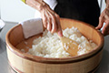 3. Cook the rice in 1 with Kombu(=kelp), place in a Sushi tub, sprinkle with the Vinegar mixture in 2, mix, cover with a wet cloth and allow to cool.