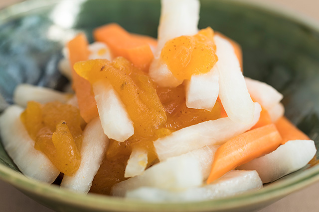 2. Put the daikon and carrot in a bowl of salted water and add the daikon and carrot to the water and let them wilt.