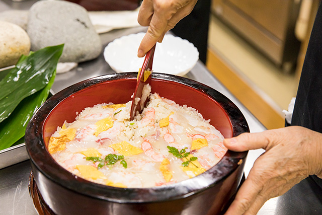 4. Sprinkle local sake onto a sushi bucket and add the rice from step 3 into the bottom of the bucket to a thickness of 2 to 3 cm. Top the rice with dried daikon radish, carrots, and fuki (=Japanese butterbur). Add another layer of rice on top of the vegetables and then top the rice with shiitake mushrooms, bamboo shoots, sea bream, shrimp, and Japanese pepper.