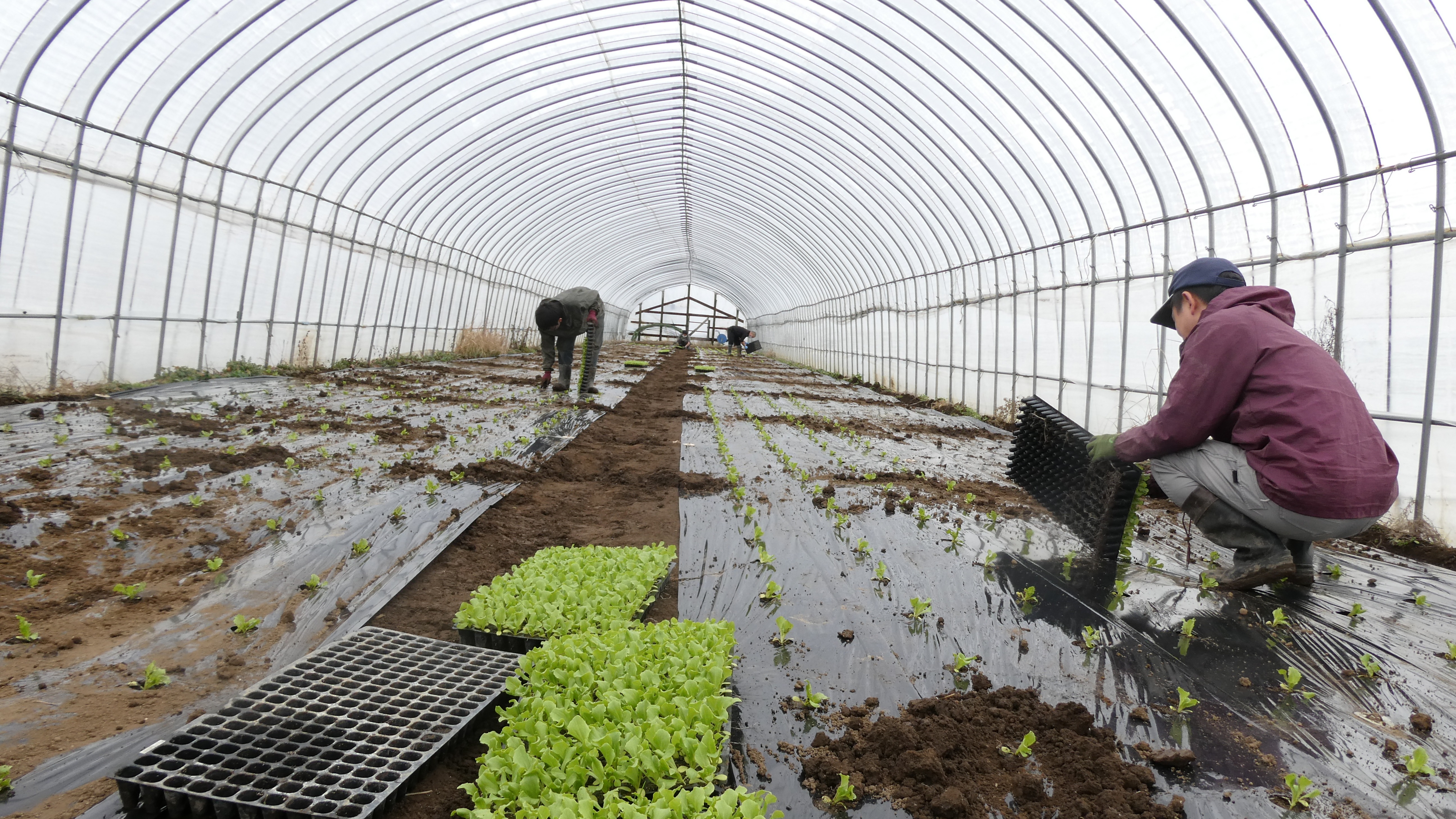 北斗市内のハウスでは、春レタスの苗を一株ずつ手で植え付ける定植作業が行われています。
