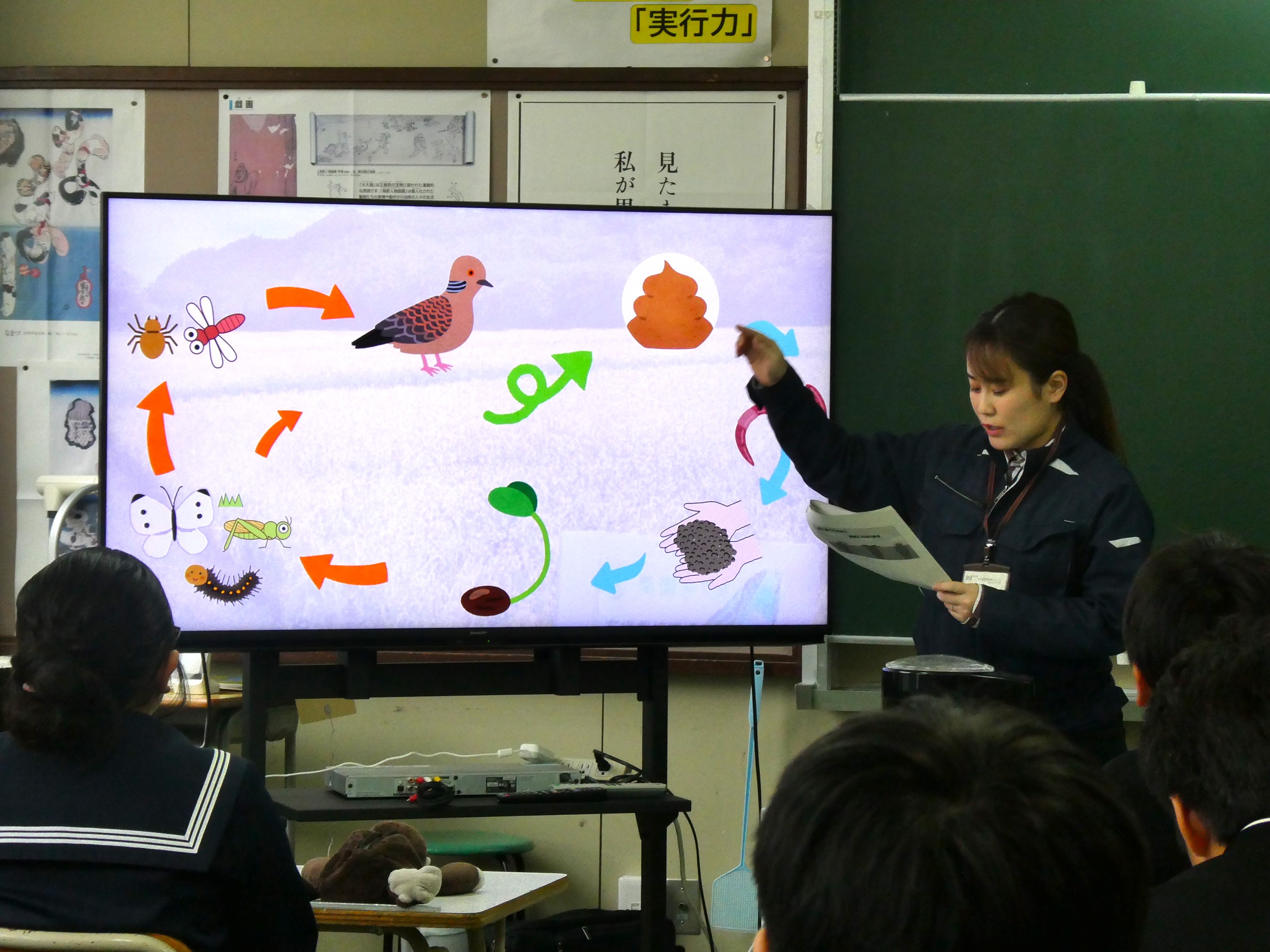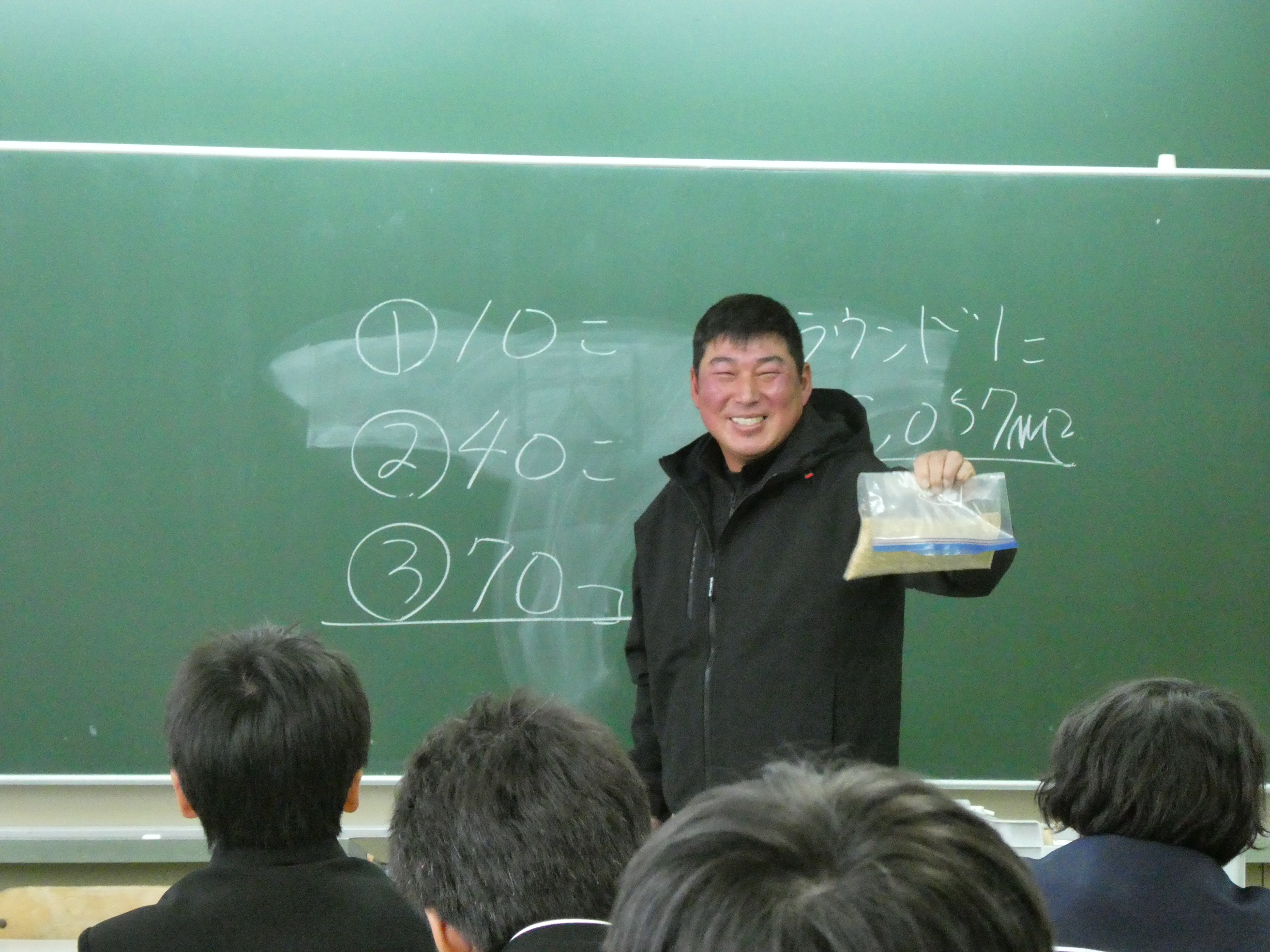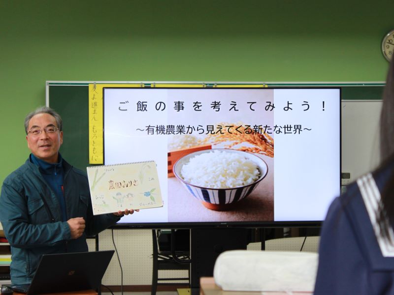 大成中学校では、農園おりざの横山氏から、米の慣行栽培と有機栽培との違いについて説明があり、生徒は米に関するクイズにも挑戦しました。