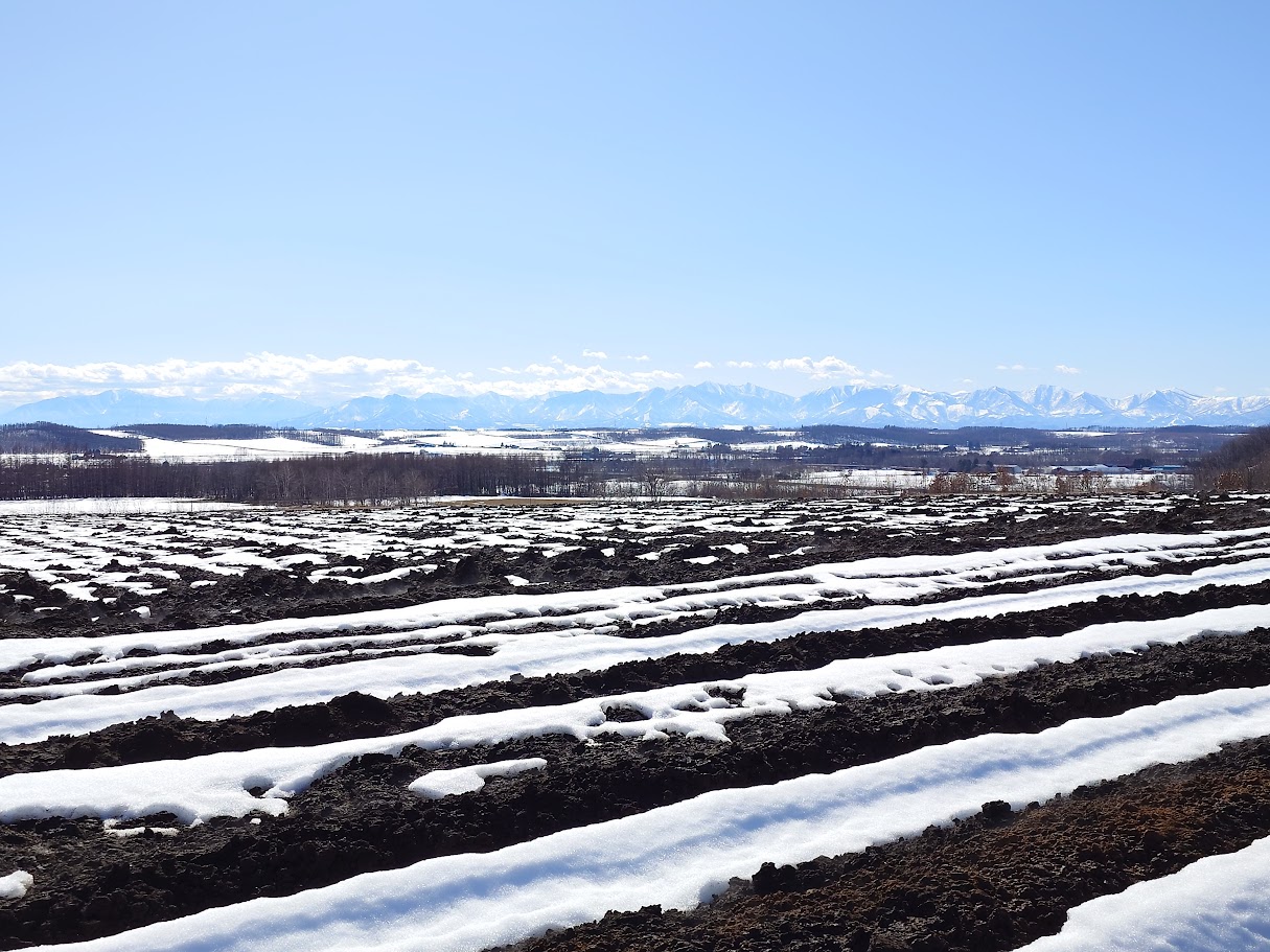 空気が乾燥して視界が澄み渡る「十勝晴れ」の空の下、縞模様の畑の向こうに、冠雪の日高山脈の姿をはっきりと見ることが出来ました。