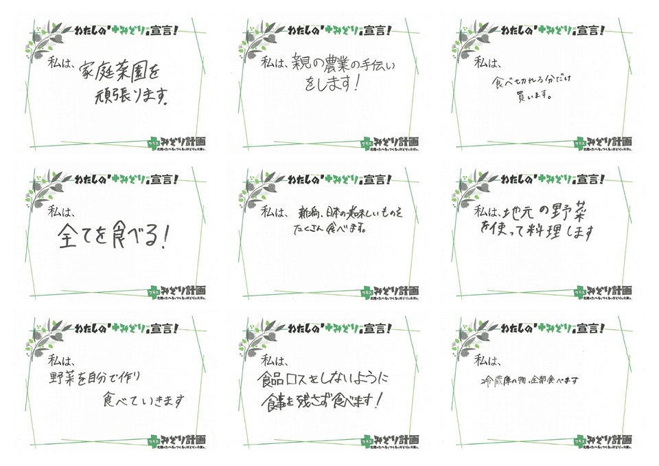 新潟県拠点からは、「みどりの食料システム戦略」と「+みどり計画」について担当職員から説明を行い、授業の最後に生徒の皆様から、「+みどり計画」の一環である「わたしの『+みどり宣言』」を記入していただきました。