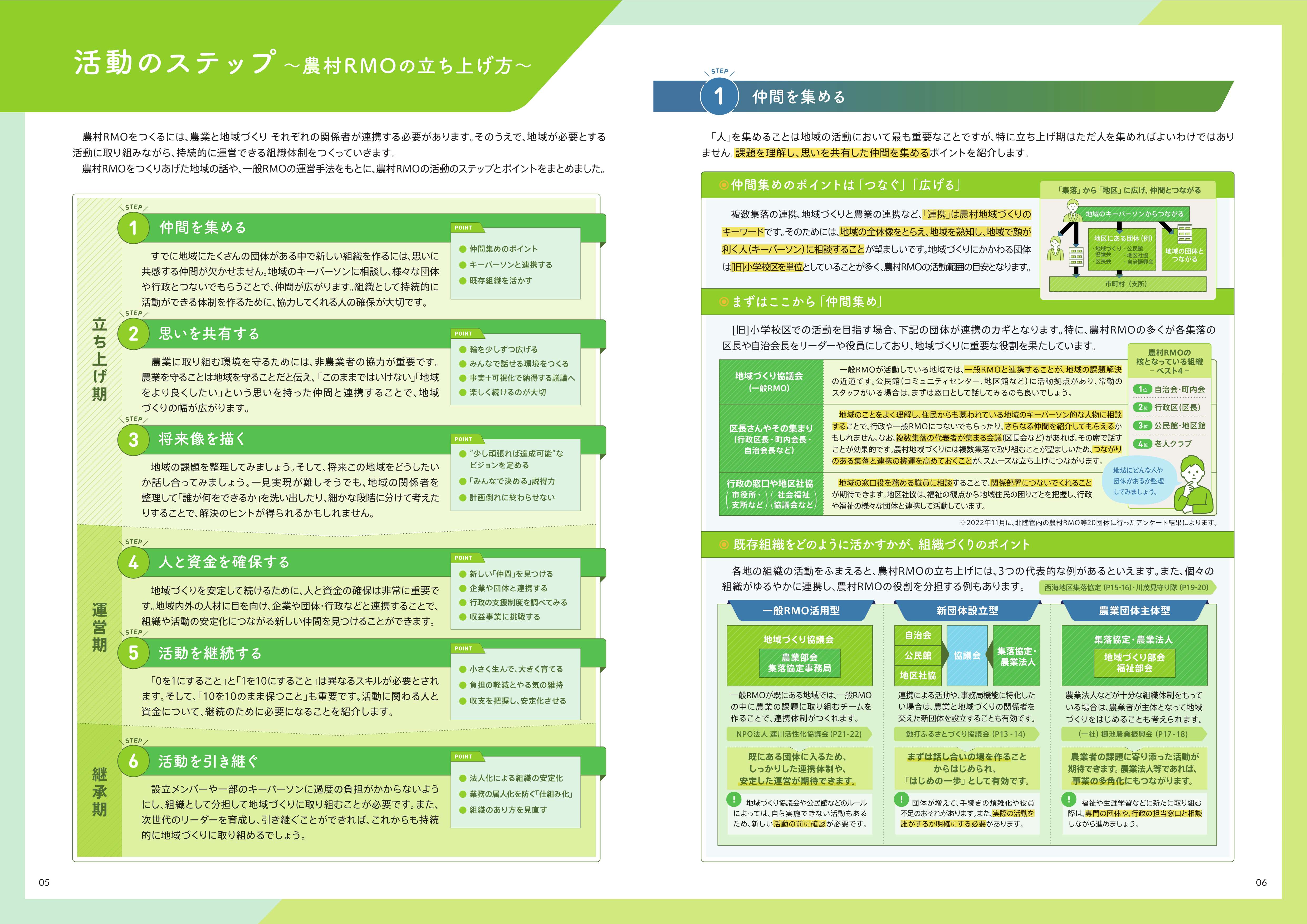 この手引きは主に「農村RMOとは」「活動のステップ」「農村地域づくり事例集」「移住者の声」の4部で構成されています。