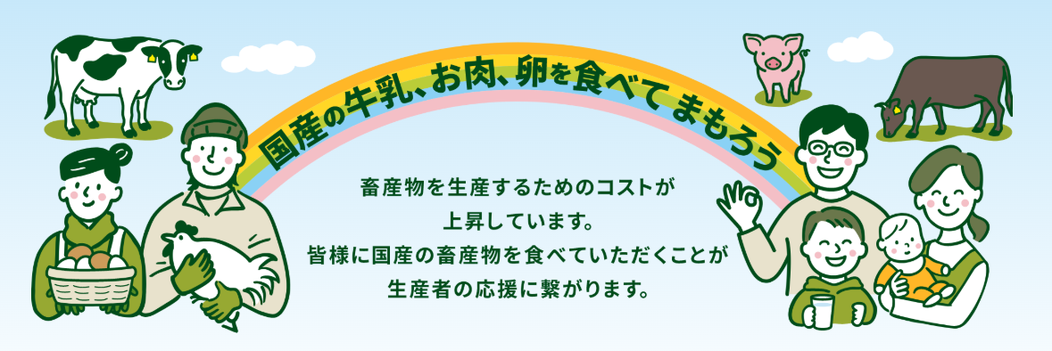 生産コストの価格への適正な反映にご理解いただき、皆さまに国産の牛乳、お肉、卵を選択いただくことが、国内の畜産農家の応援につながります。