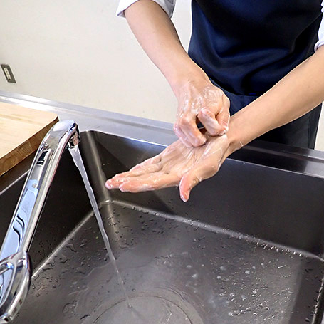 調理前はもちろん、調理中に生の肉を触った後、トイレの後等は、必ずせっけんで手を洗いましょう。