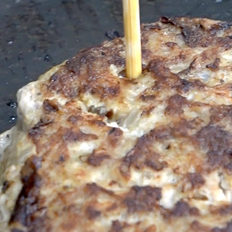 焼き色だけでは、ハンバーグの中心まで十分に加熱できたかどうかはわかりません。竹串を刺して透明な肉汁が出ることを確認しましょう。