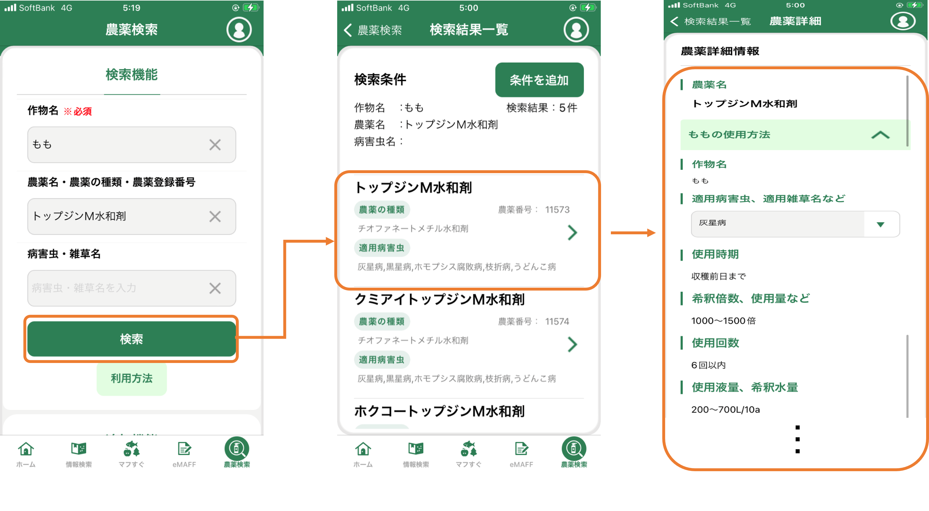 「使いたい農薬または対象の病害虫」と「農作物」を選択することで、その作物に適した農薬の使用方法を確認する機能や、