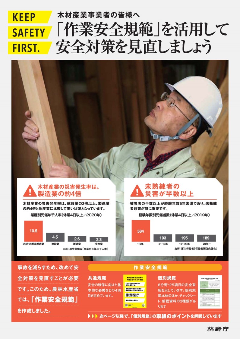 安全意識向上のためには、現場の事業者の方々に日々安全を意識していただくことや、事業者団体に事業者の取組への助言や支援をしていただくことが重要です。農林水産省では、事業者の方や事業者団体の方向に日々留意し実行していただきたい事項を整理した「農林水産業・食品産業の作業安全のための規範」を、有識者会議での議論を踏まえ策定しております。
