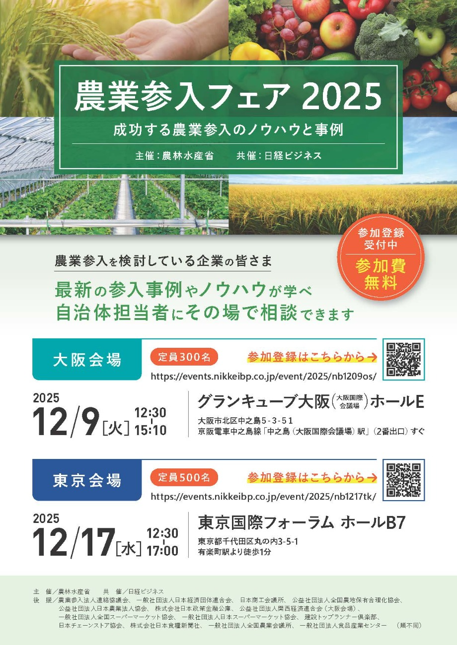 参加申込サイト・・・【大阪】農業参入フェア2025~成功する農業参入のノウハウと事例~ (外部リンク)