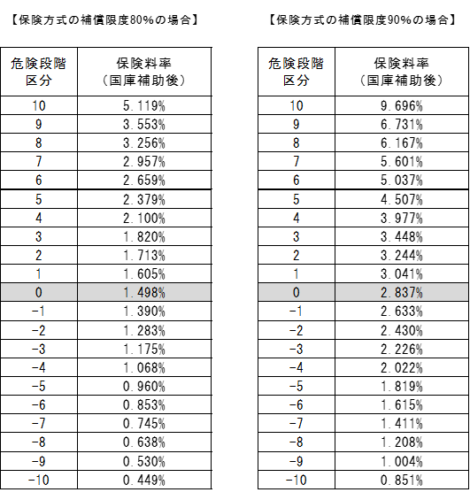 A. 2具体的には、危険段階区分「0」を中心として、上下10区分(全21区分)の保険料率を設定し、最低区分「-10」の保険料率は、区分「0」の 3割水準とすることとし、農業者ごとに、 <参考>危険段階別の保険料率(令和7年契約から適用) |