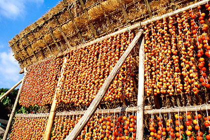 玄界灘の海岸線が一望できる標高1055mの脊振山。その脊振山を最高峰に含み、基山、九千部山、石谷山、雷山などが東西に連なる脊振山地。平坦部が比較的多い穏やかな山として、登山やハイキングなどのスポットとして有名だ。この地域で300年以上も続く、秋の風物詩「柿のれん」。手作業でひとつひとつ皮をむいた柿を干した、干し柿作りの様子で、ずらりと柿が吊るされた姿がまるでのれんのようなことから、そう呼ばれるようになった。晩秋から30~40日かけて仕上げる干し柿は、脊振山の寒暖差の激しい気候によって、やわらかく、もちもちとした食感に仕上がるという。