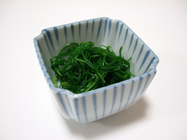 1おかひじきの根元約1cmくらいを切り取る。熱湯で約20~30秒ゆでたら水にさらし、ざるに上げてよく水気を切る。