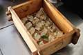 6すし枠を水で濡らしておき、経木を敷き、レモン、魚を並べ、すし飯を広げてその上に紺のり、桜エビ、針しょうがをのせてさらに経木をしき一段つくり、同じようにくり返して重ね一晩押しをする。