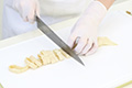 1すだれ麩は一晩水につけて戻し、1cm幅に切る。