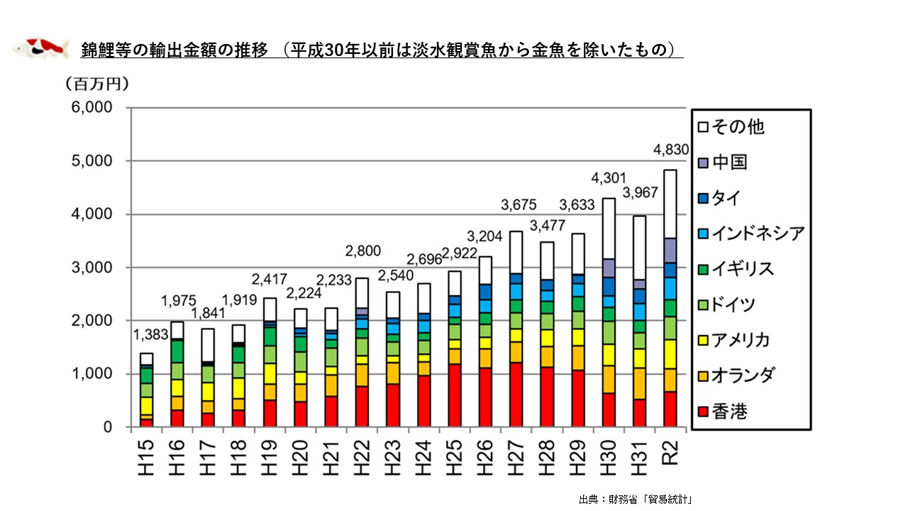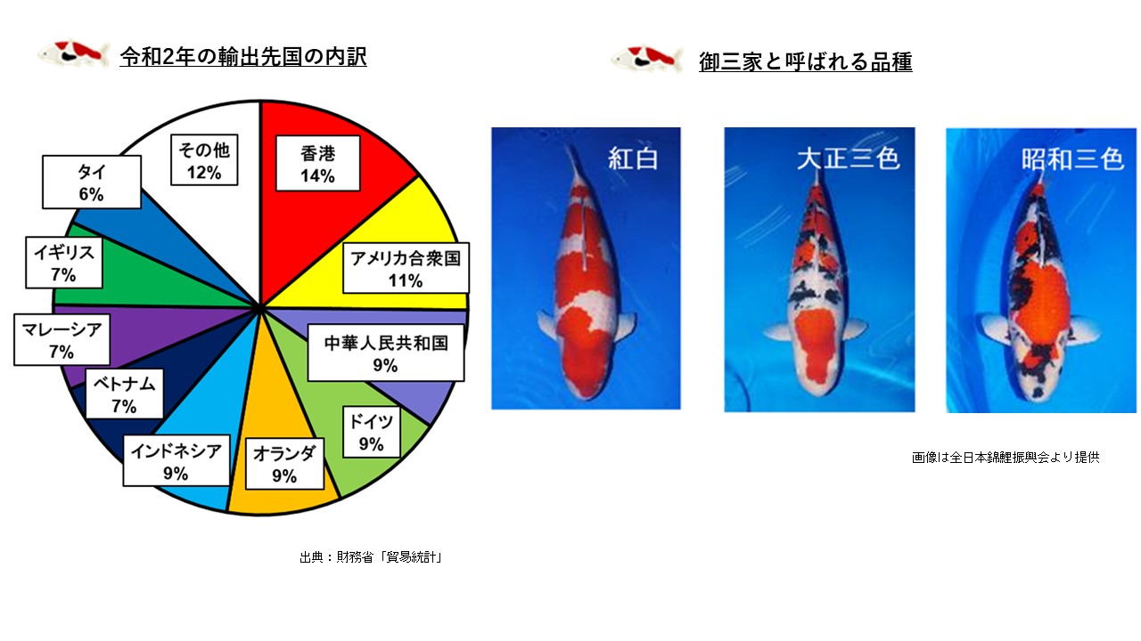 錦鯉は国内だけでなく、国外でも人気が高まっており、昨年は48億円を計上して、過去最高の輸出金額となりました。