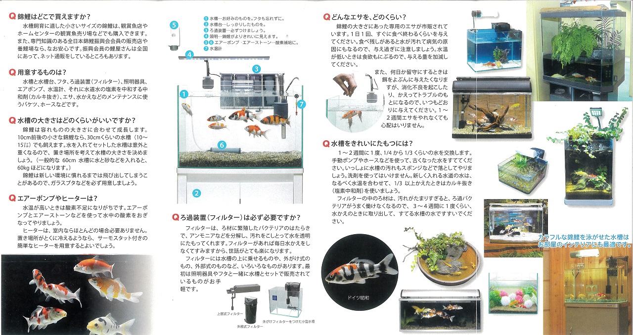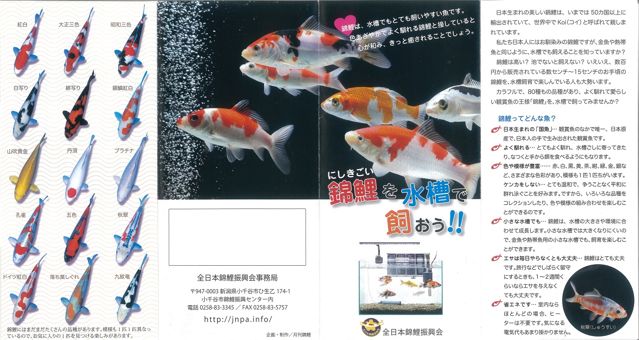 本項目では、錦鯉の飼育に必要な機材や日々の世話のやり方について紹介したパンフレットを掲載していますので、この機会に錦鯉の飼育に挑戦してはいかがでしょうか。