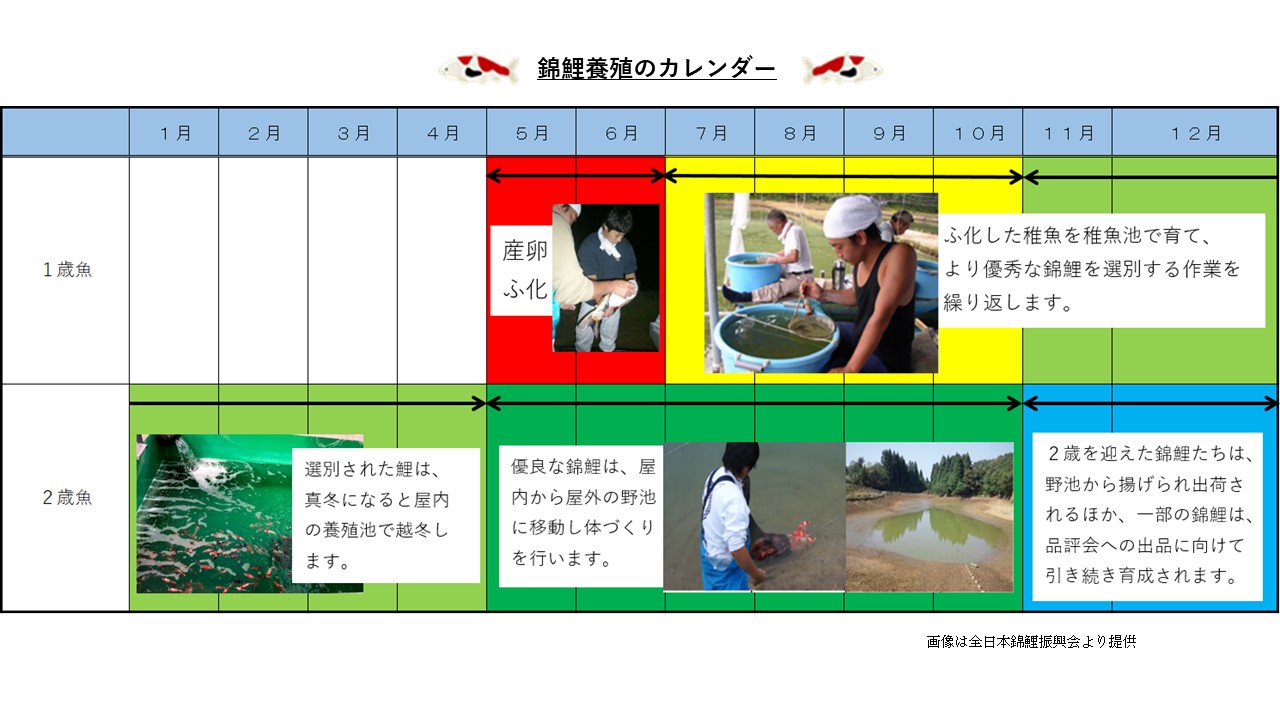 ふ化した稚魚から継続的に選別を繰り返し、2歳魚になる錦鯉は、孵化した稚魚のうちのわずか0.05%と言われています。