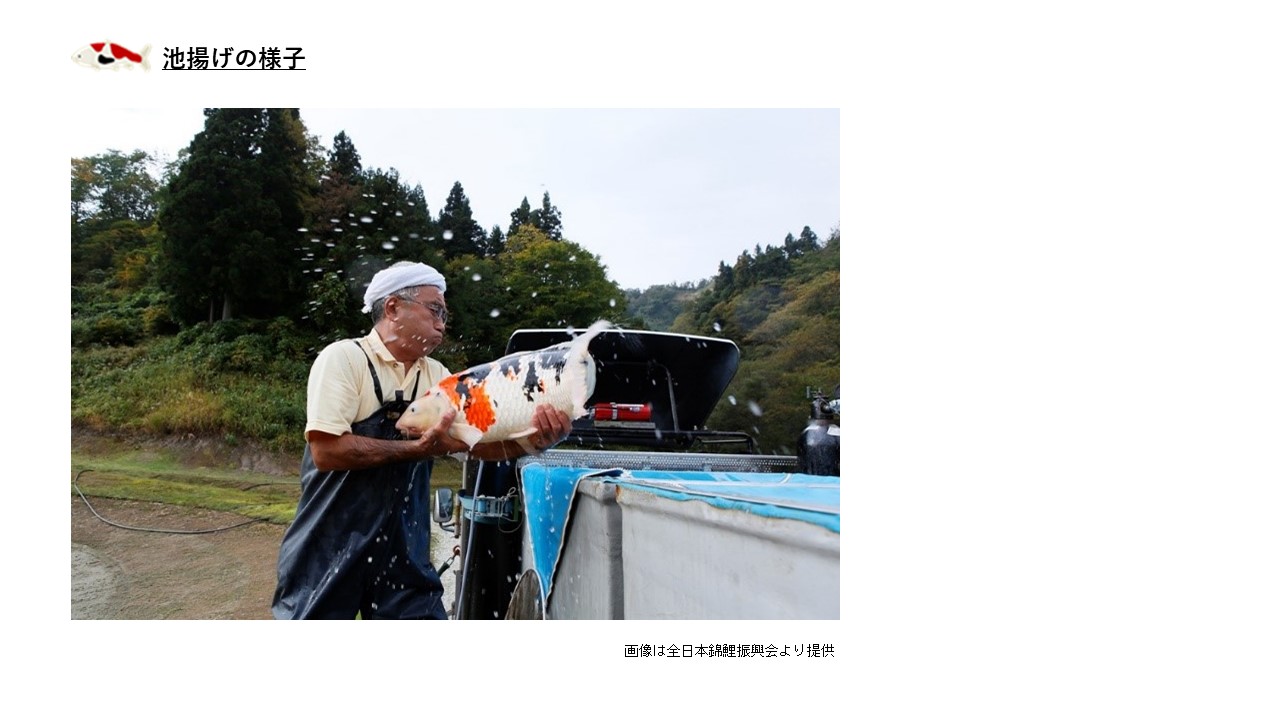 | 1. 錦鯉の歴史 | 2. 錦鯉の産地 | 3. 錦鯉の輸出 | 4. 錦鯉養殖の一年間 | 5. 映像資料 | 6. 錦鯉を水槽で飼おう!! |