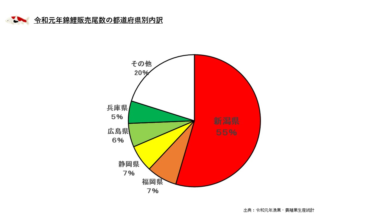 また、錦鯉の販売尾数でみても約55%にあたる1,508,013尾(令和元年)が新潟県で販売されており、同県は錦鯉の最大の産地となっています。