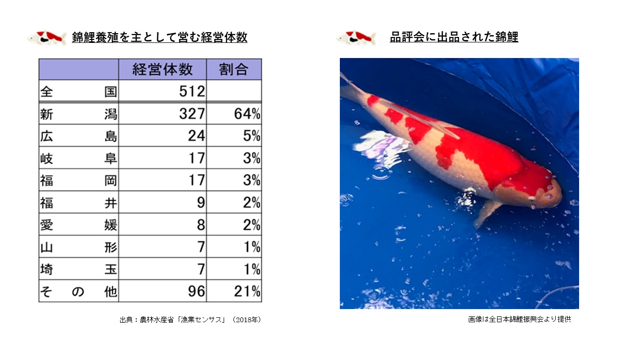 錦鯉養殖を主に行う経営体は全国に512(平成30年)あり、半数以上が新潟県に所在しています。