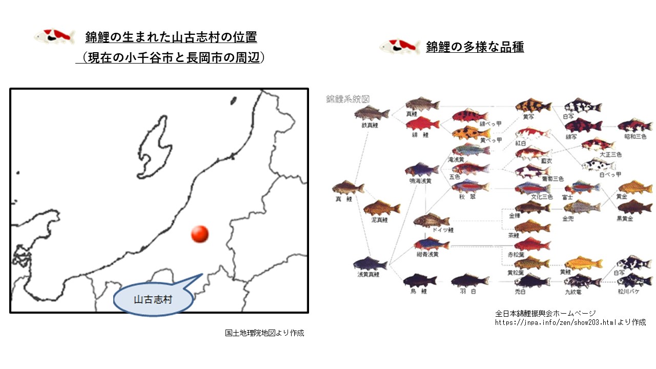 現在の錦鯉の祖先にあたる緋鯉は、江戸時代の中期ごろ新潟県の中央部に位置する山古志地方で食用として飼育されていた真鯉が突然変異して産まれたと考えられています。