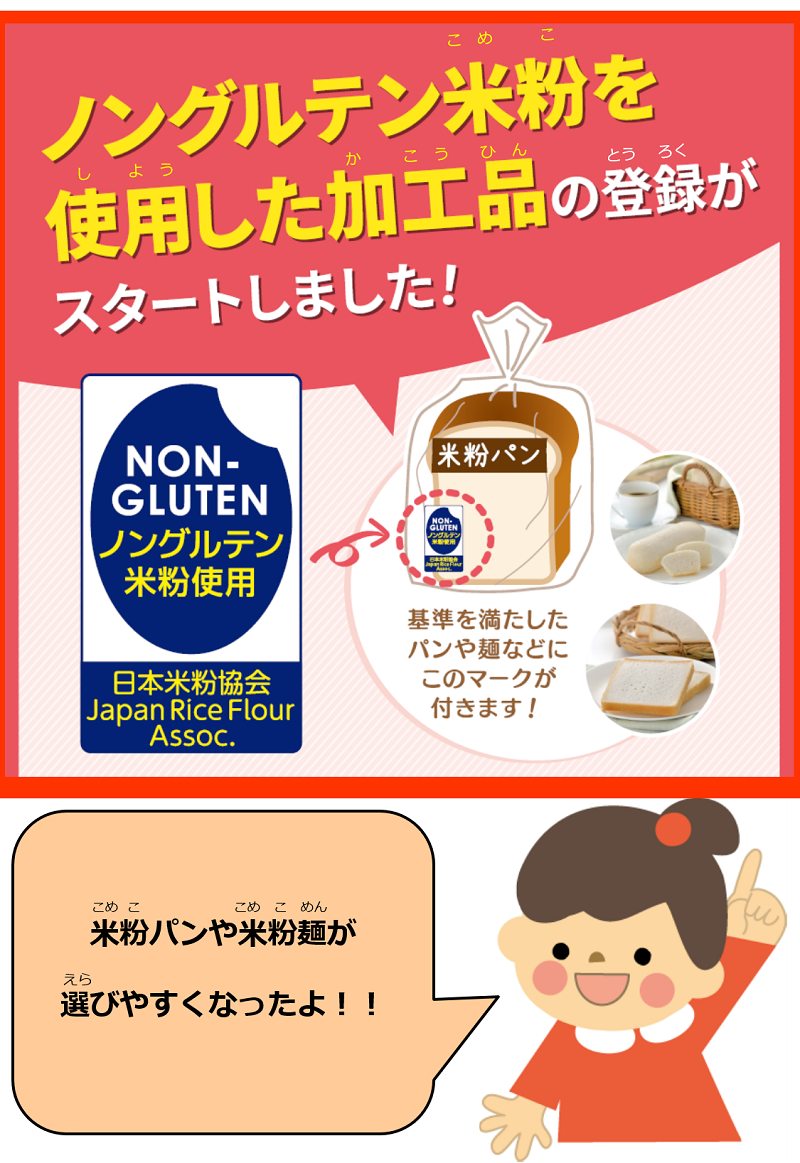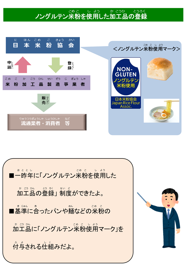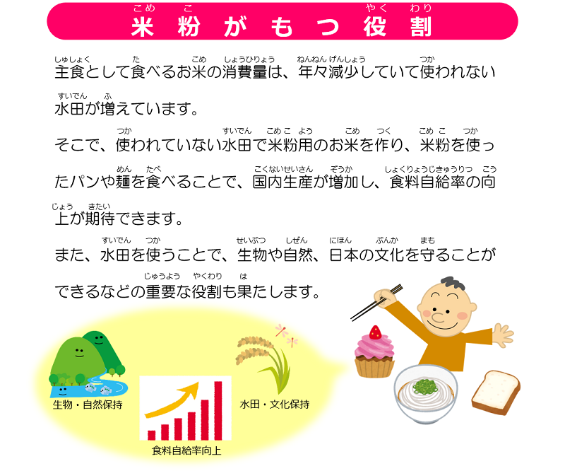 農林水産省(のうりんすいさんしょう)では、米(こめ)の消費拡大(しょうひかくだい)の取組(とりくみ)の一環(いっかん)として、米粉(こめこ)の普及(ふきゅう)を目指(めざ)しています。