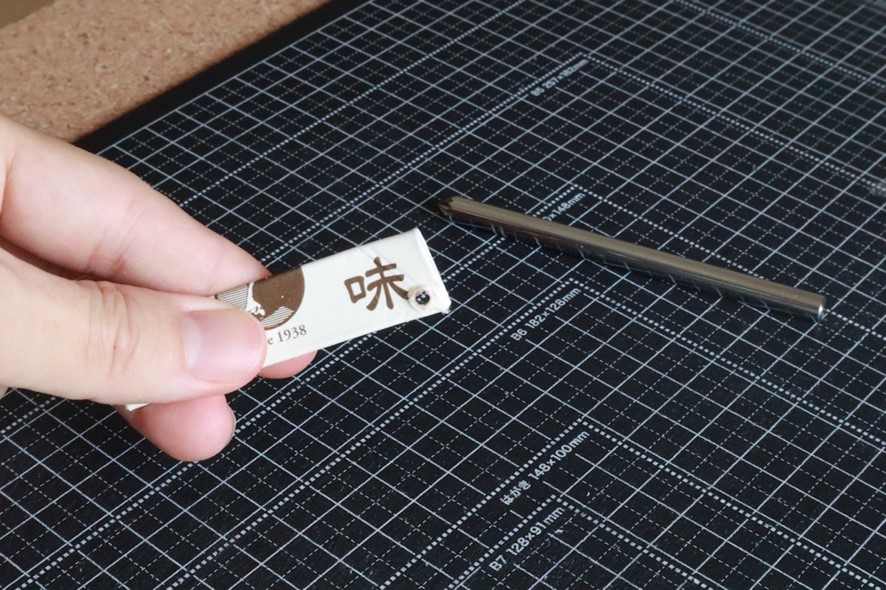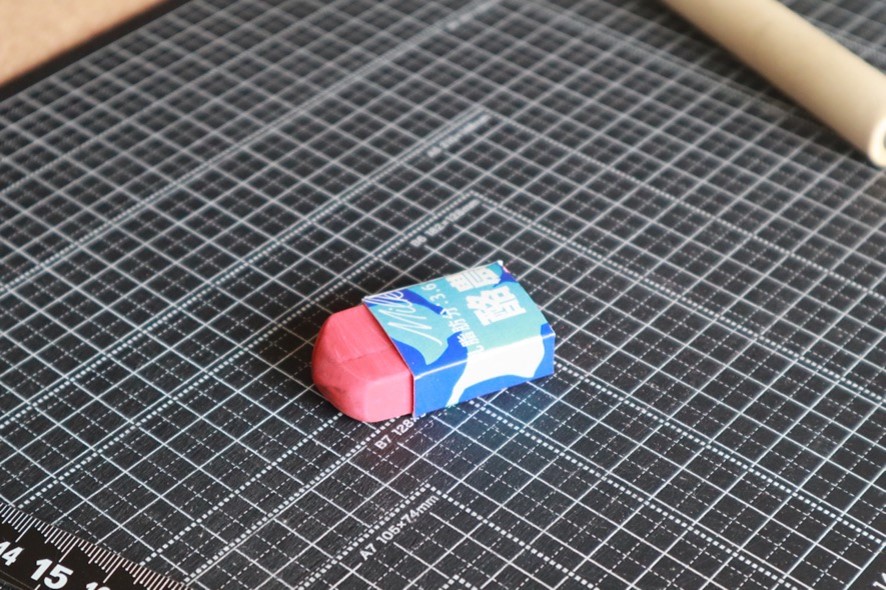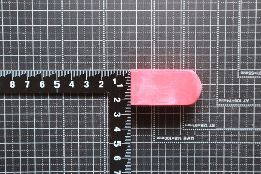 消しゴムの大きさを測ります。写真では 横・奥行きが2.4cm・1cmでした。