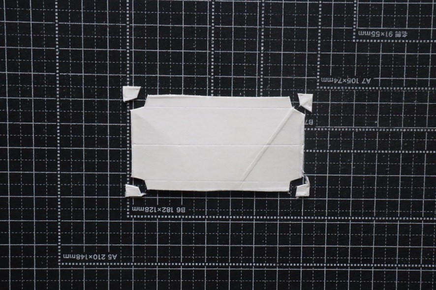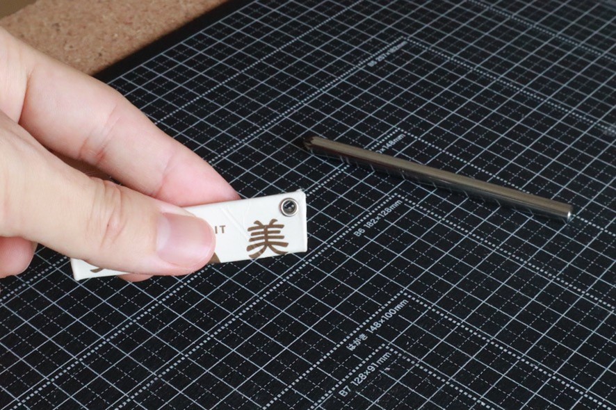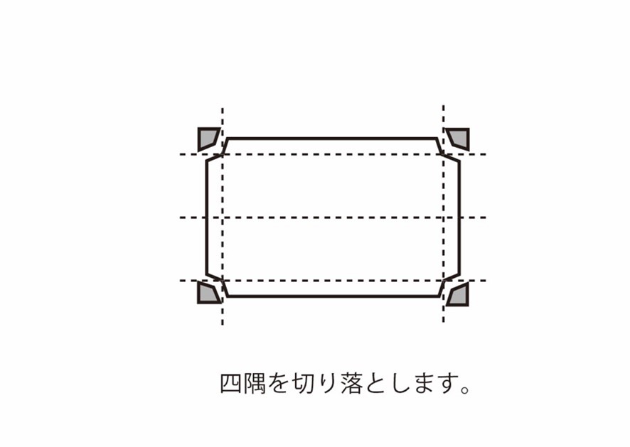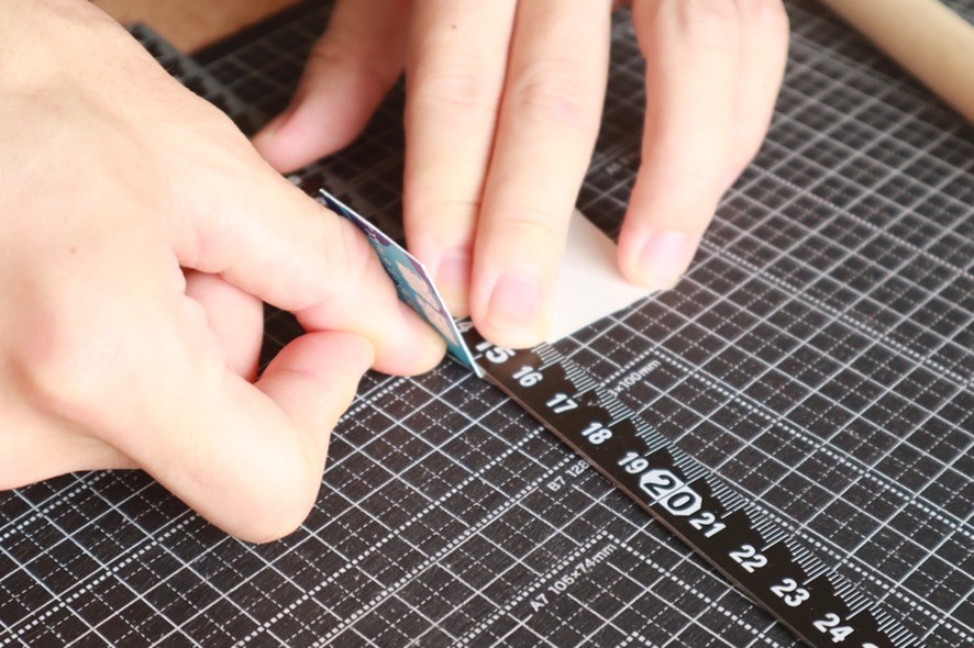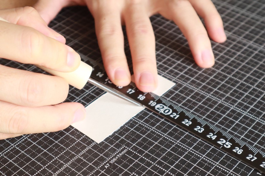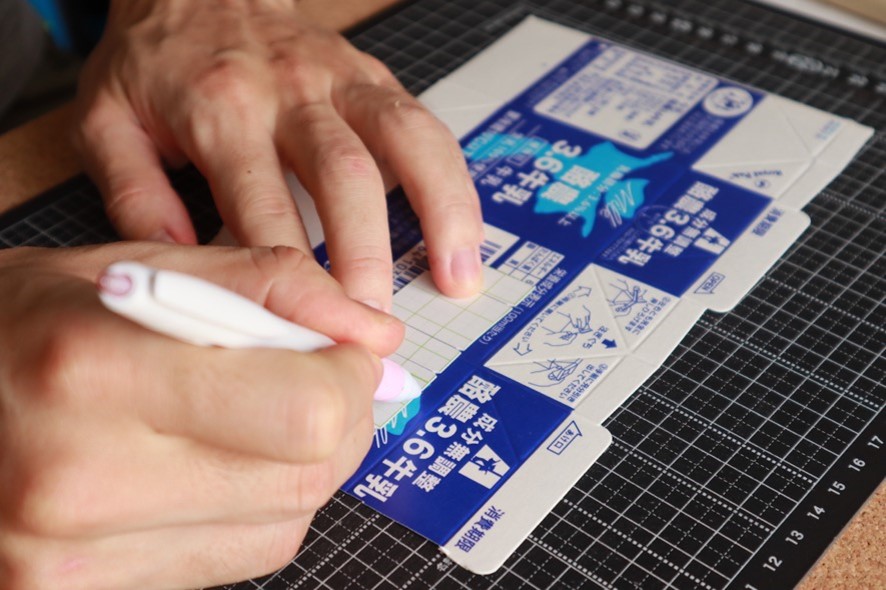 キリをパックに当てて、周囲の約5mm内側と中央に折り目になる線をつけます。写真のようなメモリのついたカッターマットを使うと便利です。