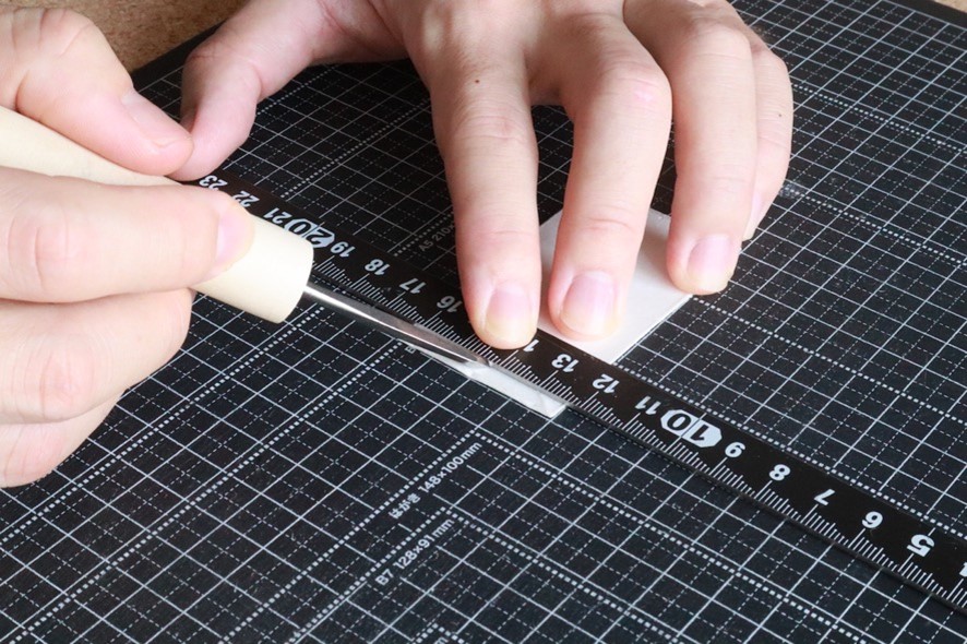 キリや、カッターの刃の切れない側を使って折り目をつけます。