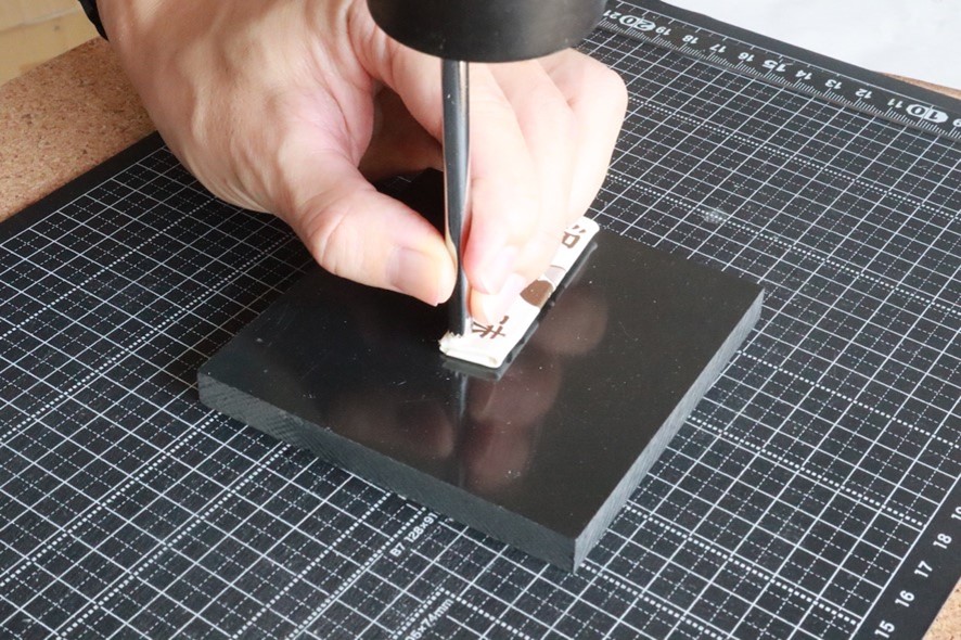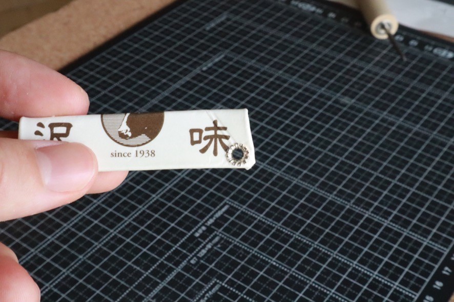 菊割棒をハトメに当てて、木槌で叩いてハトメをつけます。