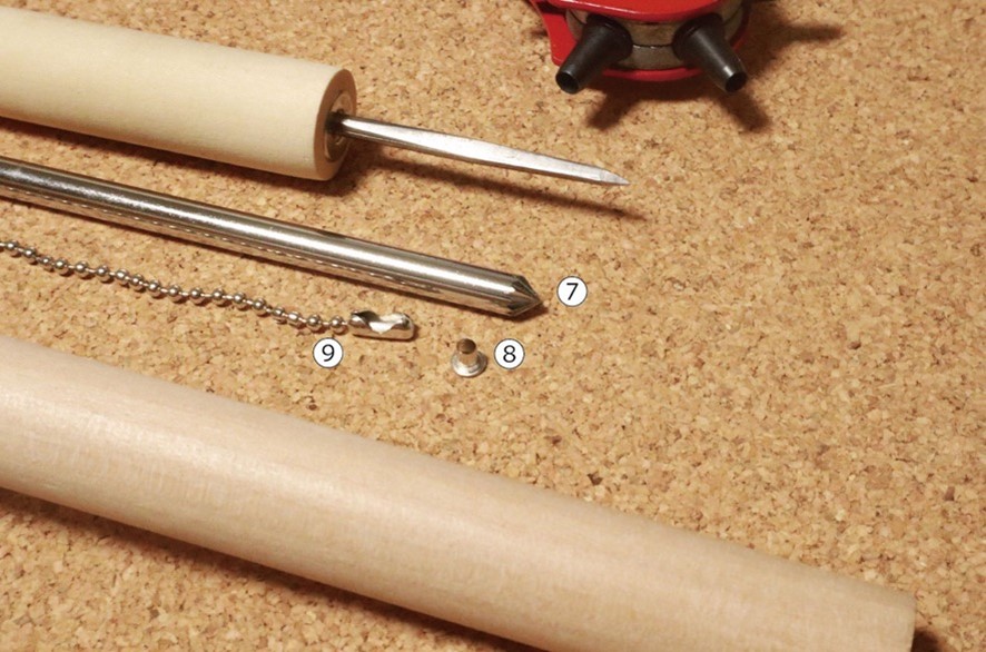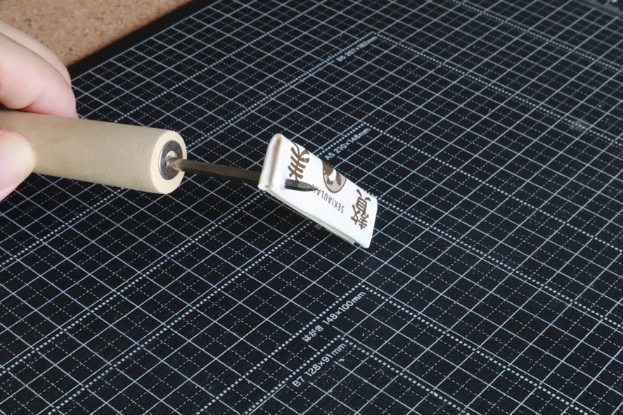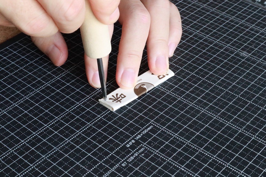 端に穴あけポンチ、またはキリを使って穴を開けます。