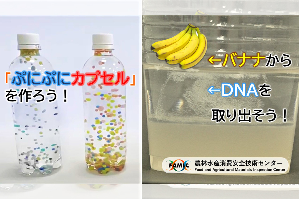 FAMICがみんなのお家でもできる実験を紹介するコーナーです。2種類の実験(バナナからDNAを取り出そう、ぷにぷにカプセルを作ろう)の体験ができます!
