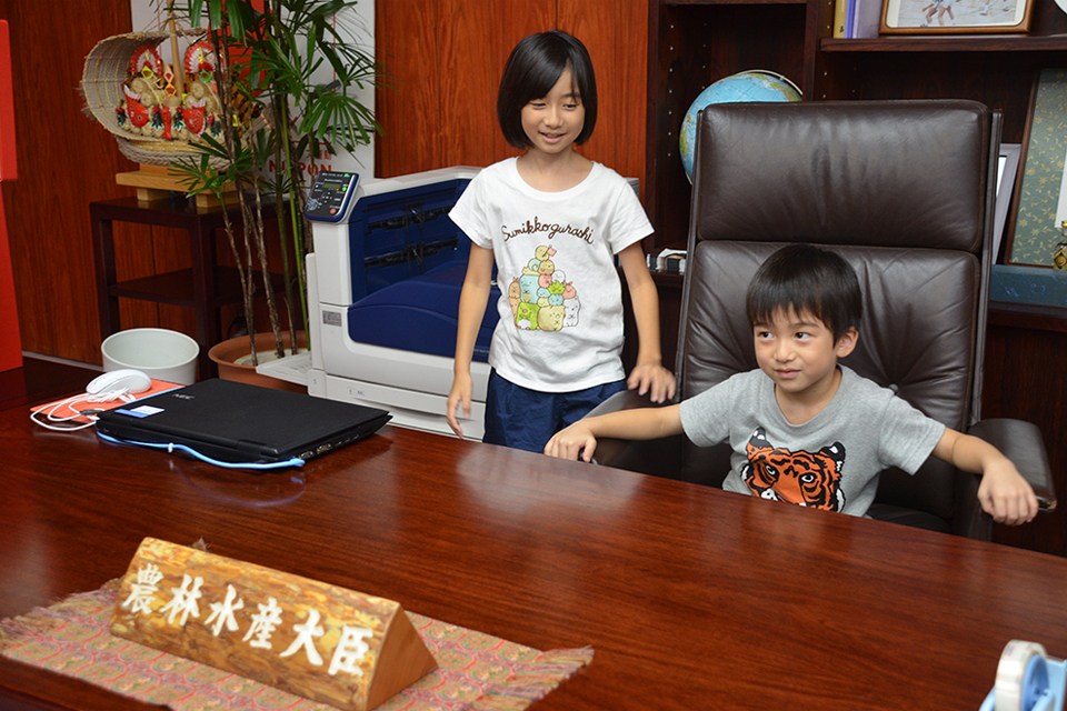 大臣室、記者会見室を見学して、大臣のイスに座ったり、記者会見の様子を体験してみよう!