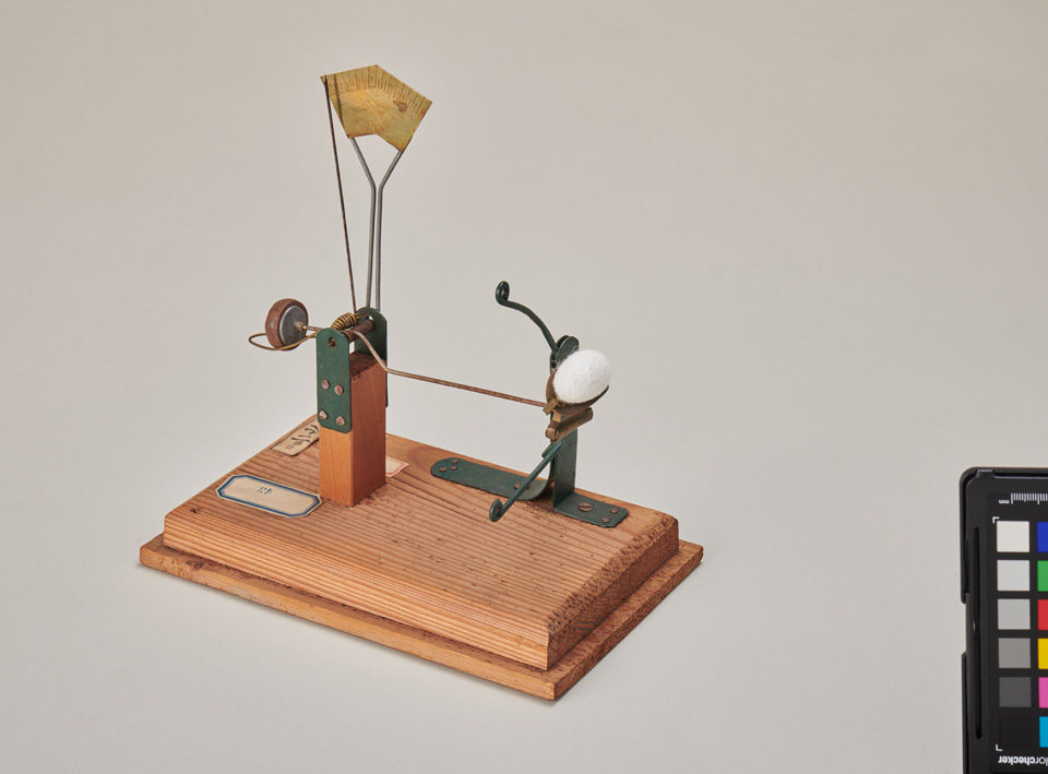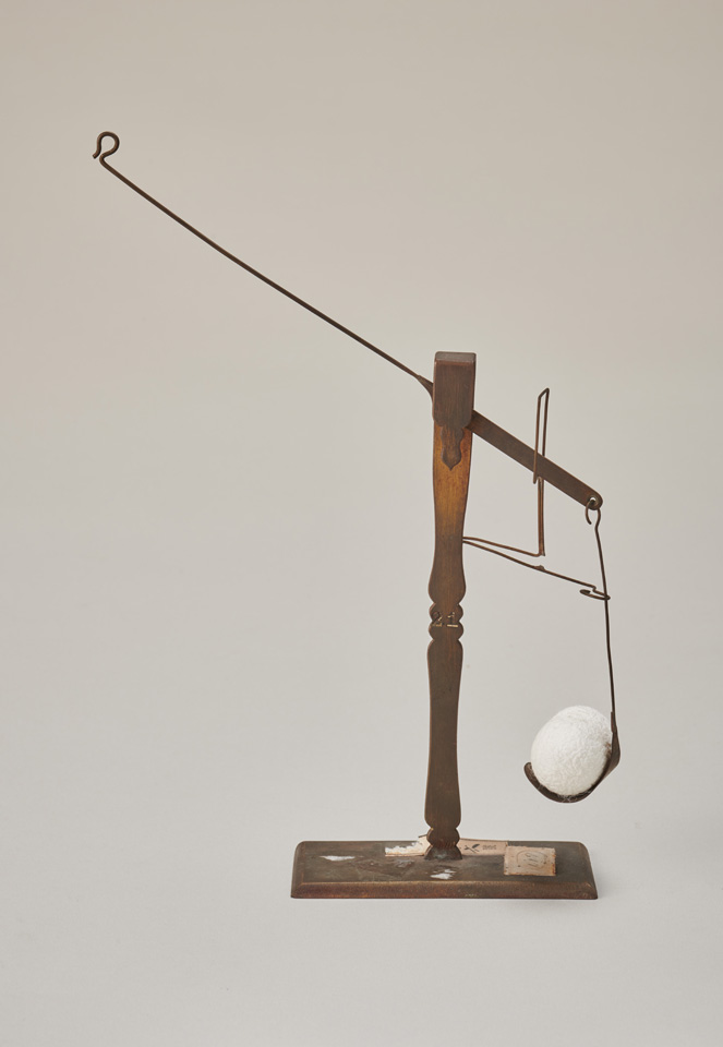 1粒繭用種繭雌雄鑑別器。重い繭は下がり、軽い繭は上がる天秤の原理を利用し雌雄鑑別をする。松本市の大日本一代交配蚕種普及団(片倉)で考案し、使用された。