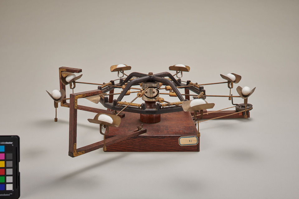 回転式種繭雌雄鑑別器。天秤の原理による。繭8個をそれぞれの皿に乗せて回転させ、雌が重く、雄が軽いという重さにより、落下する場所が異なるように作られ、雌雄を鑑別する。上伊那郡 片桐村大沢太郎氏考案。