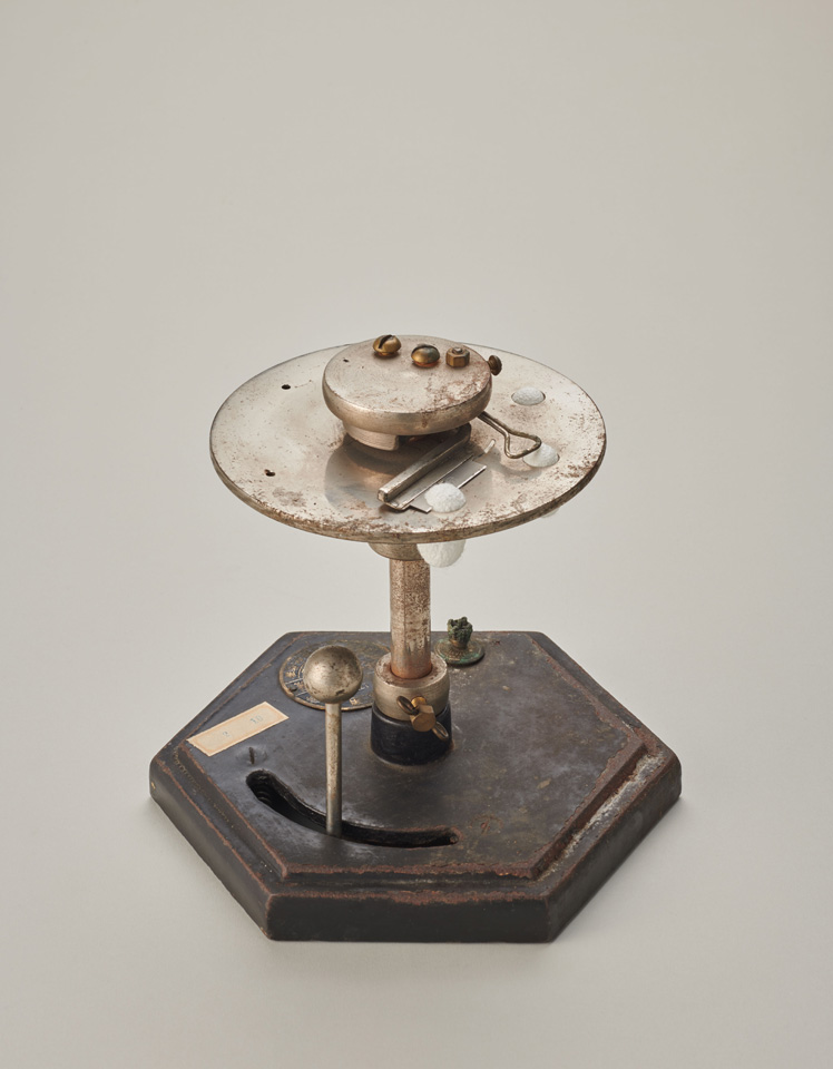 1粒繭用種繭雌雄鑑別器。雌の蛹は重く、雄のそれは軽いので、その重さを比較して雌雄鑑別を行った。天秤の原理で繭が上方へ行くと軽く、下方では重くなる現象を利用し、装着していあるネジで軽・重の限界値を設定することにより、雌雄の区分けができる。
