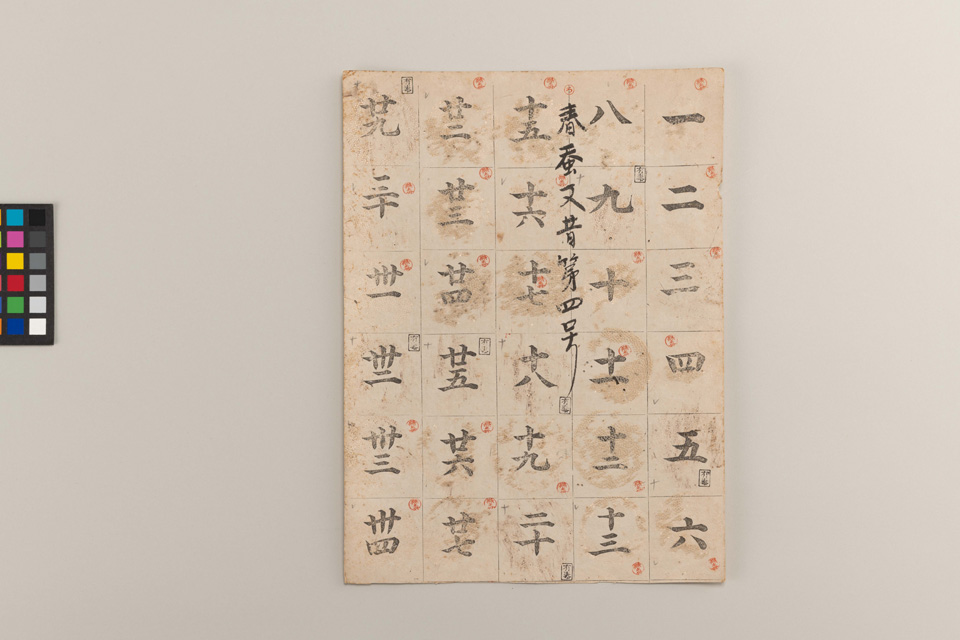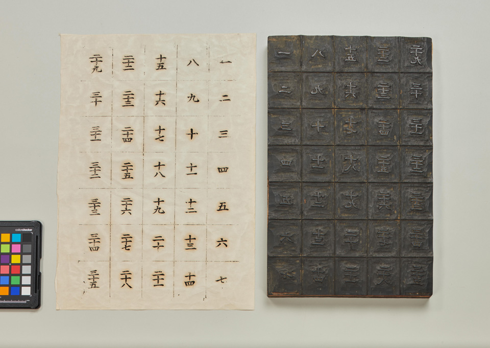 蚕卵紙に印刷する版木。35マスあり、表面には漢数字、裏面にはイロハ文字が彫られている。印刷した蚕卵紙の上に丸い形の蛾輪を乗せ、一蛾ずつ蛾輪の中で卵を産ませる。22..5×35cm。