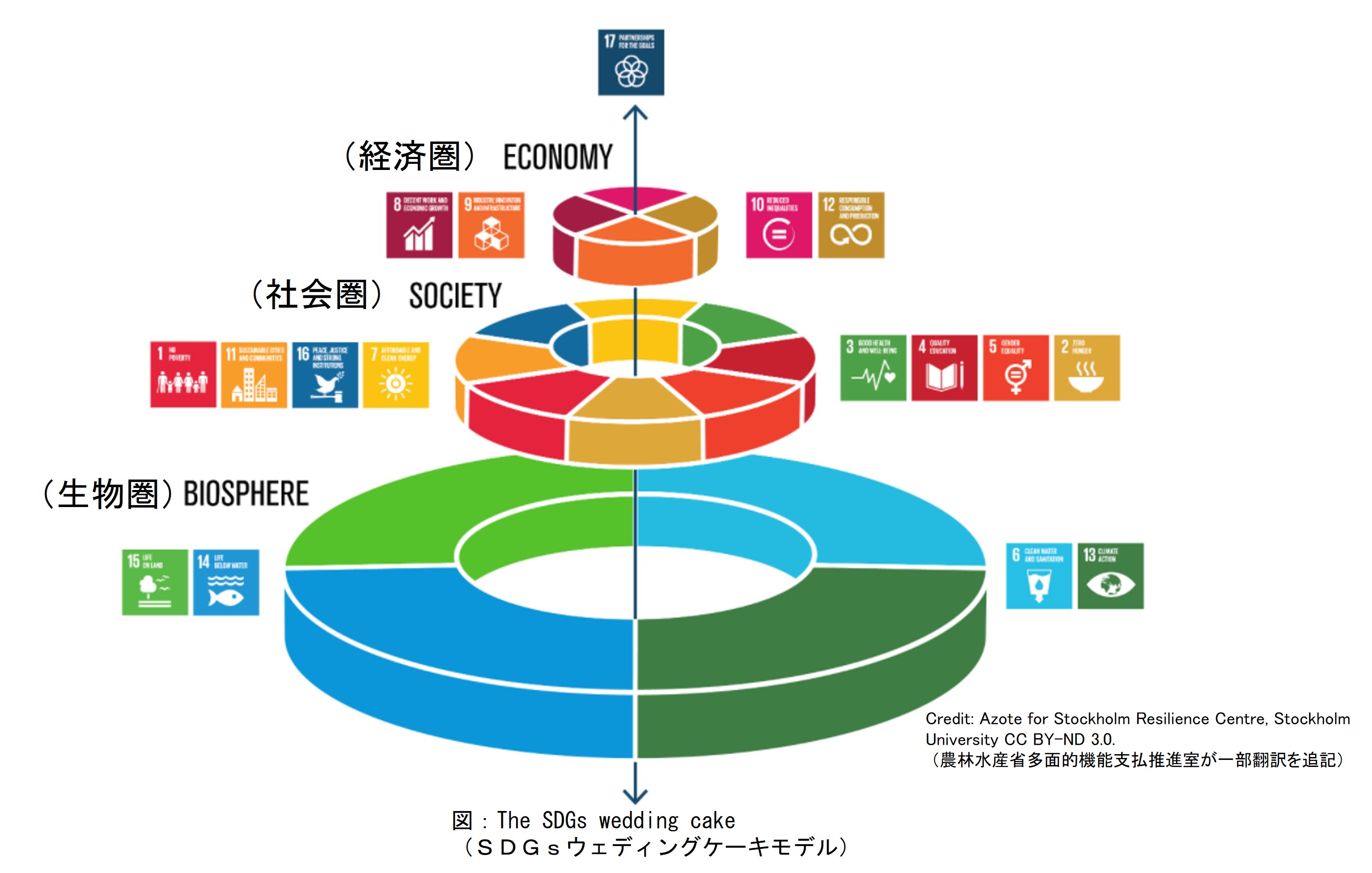 同モデルは、SDGsの目標17をケーキの頂点として、その下にある3つの階層「経済圏」「社会圏」「生物圏」によって構成されています。この3つの階層の並び方はそれぞれ意味があり、「経済」の発展は生活や教育などの社会条件によって成り立ち、「社会圏」は下層の「生物圏」、つまりは人々が生活するために必要な自然の環境によって支えられていることを表しています。