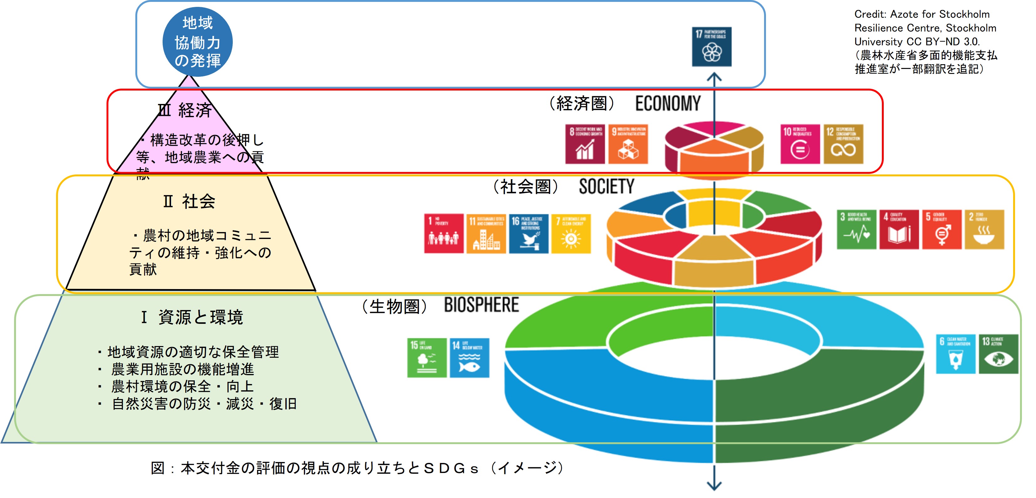 このように、SDGsの構成と本交付金の評価の視点の成り立ちには類似性があるため、本交付金の3つの評価の視点とSDGsウェディングケーキモデルの3つの階層とを関連付けて整理しました。