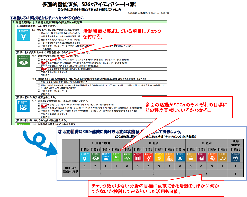 「多面版SDGsアイディアシート(案)」は、多面的機能支払の具体的な活動や組織体制・運営方法と各目標の関係をチェックシートの形で整理したものです。各活動組織が実践している取組にチェック☑を入れて、目標毎のチェック数を数えることで、どの目標の達成にどの程度貢献しているかを簡単に確認できるようになっています。※「多面版SDGsアイディアシート(案)」は試行中のため、アイディアシートの内容が変更される可能性があります。