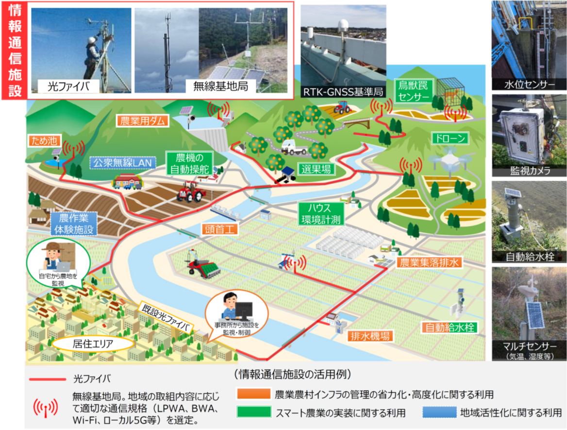 人口減少、高齢化が進行する農村地域において、農業水利施設等の農業農村インフラの管理の省力化・高度化やスマート農業の実装を図るとともに、地域活性化を促進するため、情報通信環境の整備を支援します。