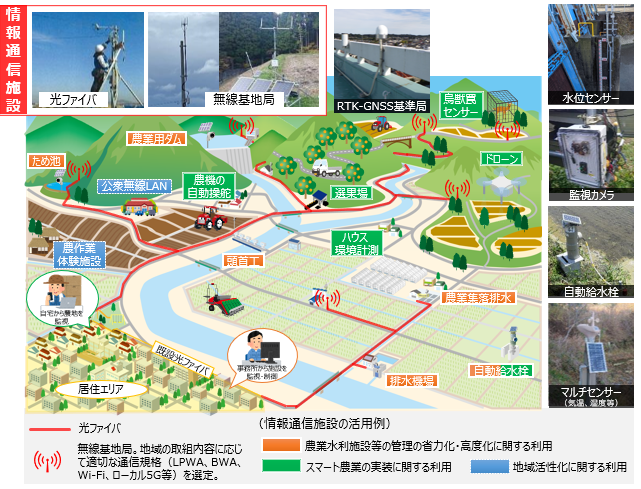 農業者が減少する中、生産性の向上、生産コストの低減に向け、農業水利施設等の管理の省力化・高度化やスマート農業の実装を推進するとともに、地域活性化を促進するため、農村地域における情報通信環境の整備を支援します。
