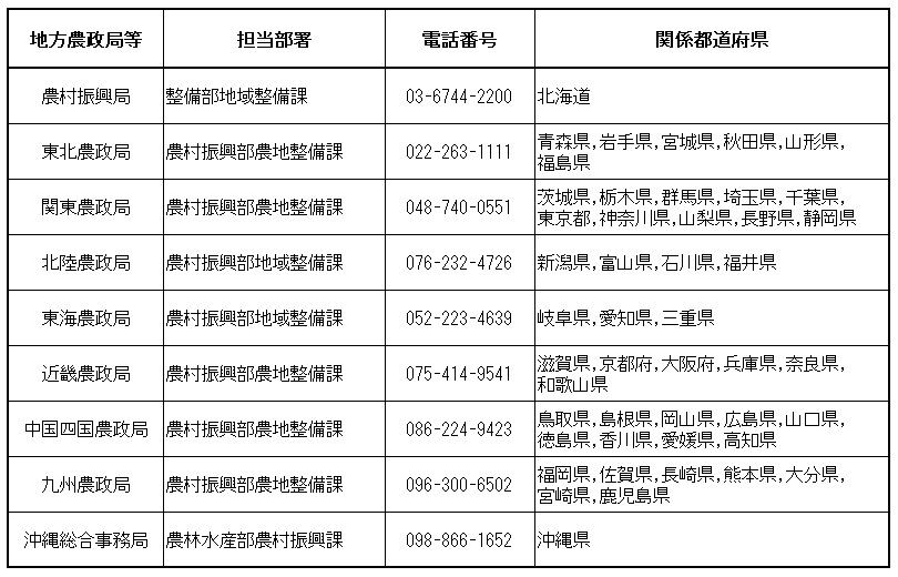 なお、農道の整備や農道橋の耐震化対策などの各種補助事業に関することについては、次の地方農政局等にお問合せください。