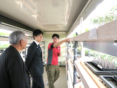川俣町にて植物ワクチン接種苗生産システムの現地調査を行う鈴木農林水産大臣