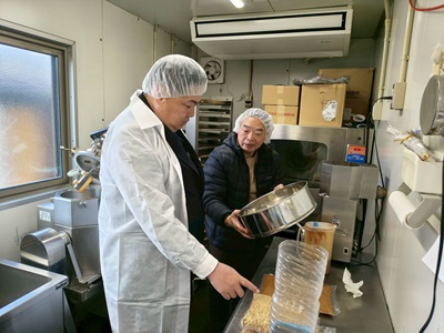 長野市でヘーゼルナッツ加工施設を視察する山本農林水産大臣政務官(左)